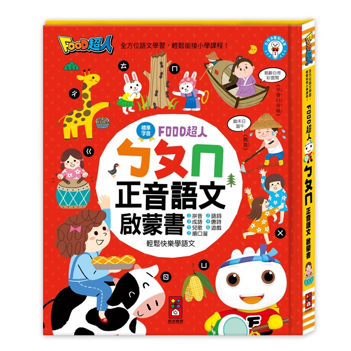 ※本書可搭配《FOOD超人多重點讀筆》,聆聽標準的國語發音,學習「直接拼音綜合法」,並設有互動遊戲模式,讓孩子找出正確的語詞或拼出注音符號,反覆練習拼音,讓學習充滿趣味!本書附贈的掛圖也可以點讀,將掛圖貼在牆上,以圖像和詞語連結起來,隨時隨地把學習融入孩子的生活中。