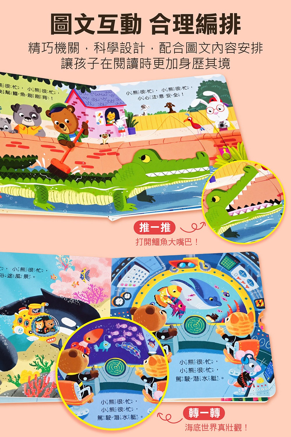 透過推、拉、轉操作,讓畫面活起來,鮮豔的繪圖跟互動機關引起孩子的興趣,主動探索書中世界。