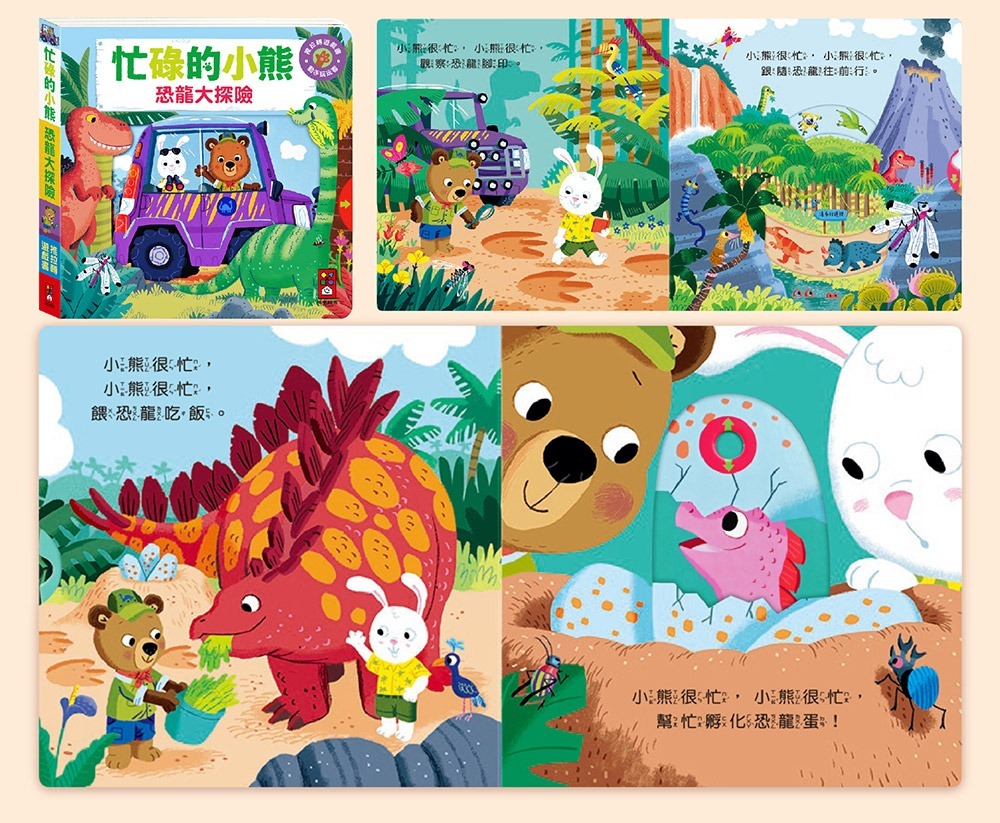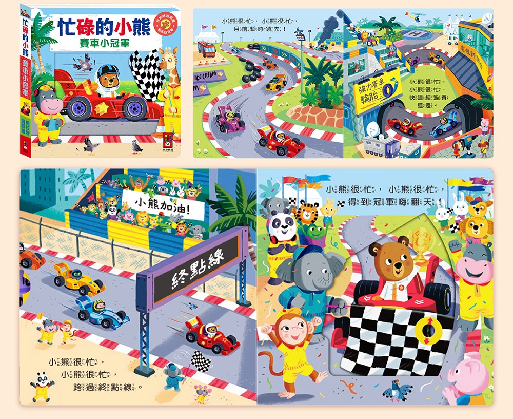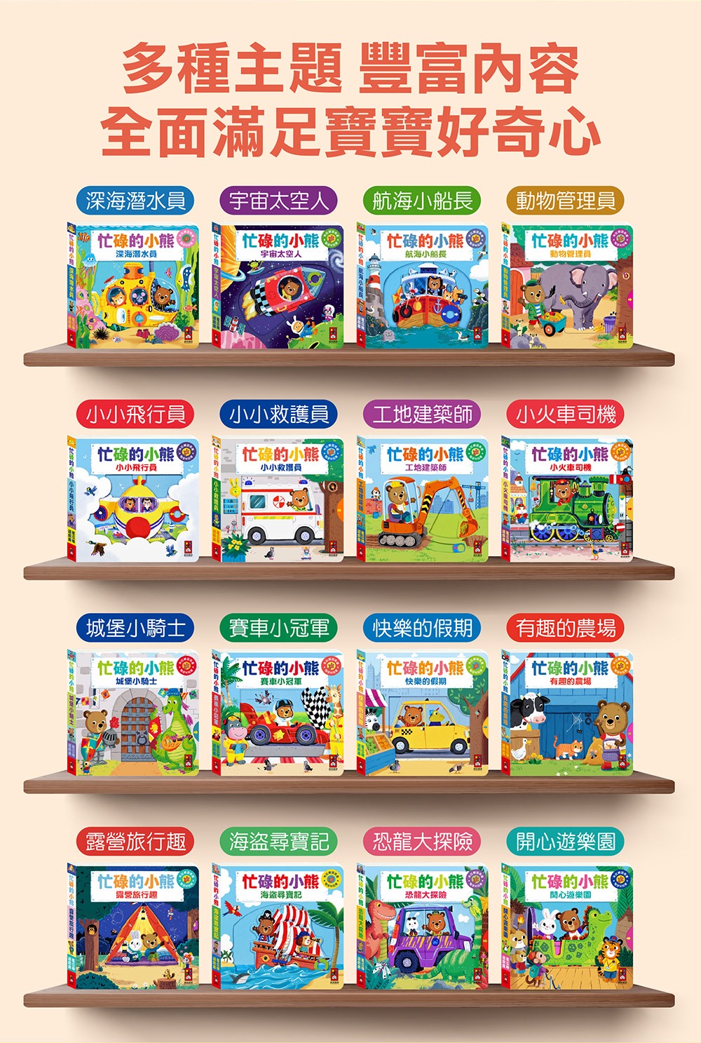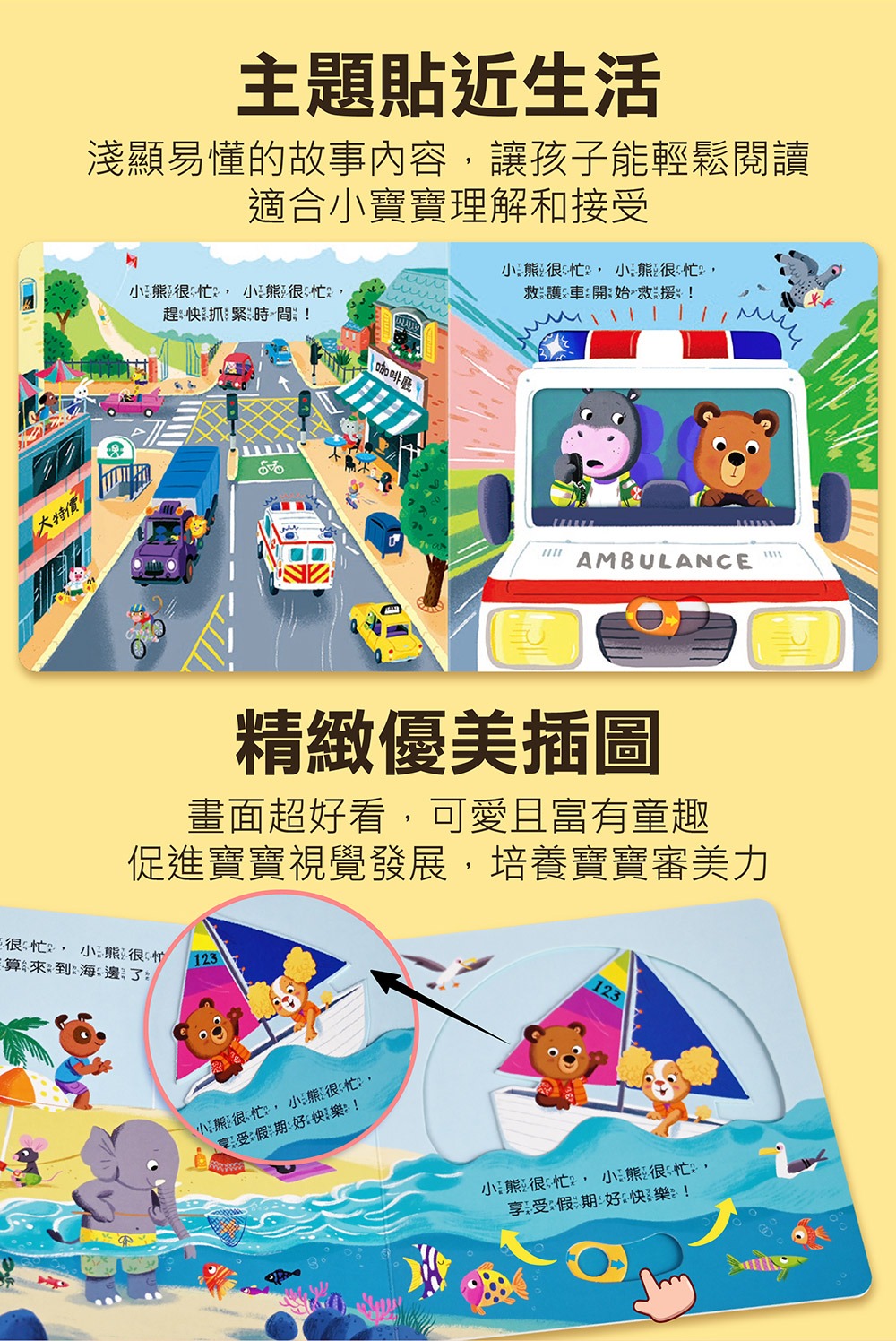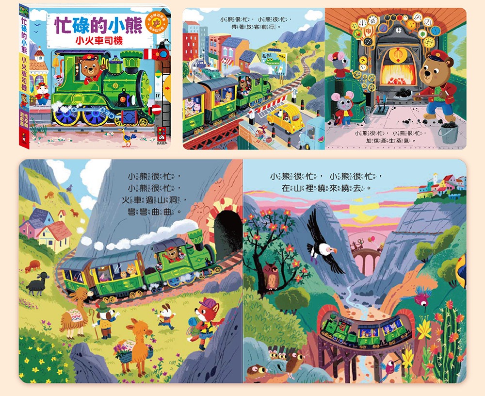 繪本鮮豔精緻的插圖吸引孩子目光,刺激孩子閱讀慾望,一起和忙碌的小熊探索生活不同風景,從閱讀跟遊戲中探索世界。