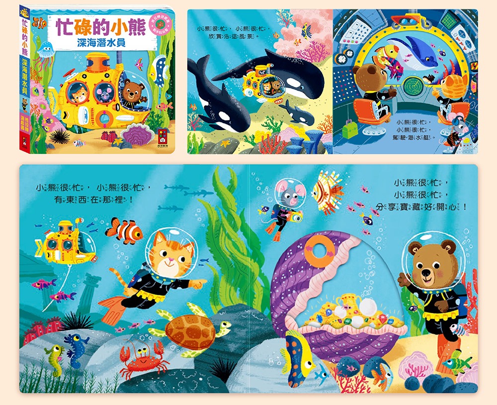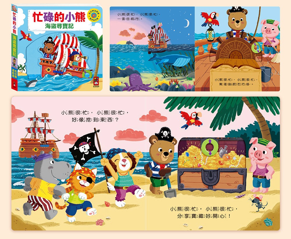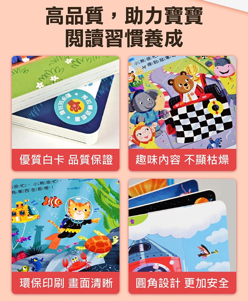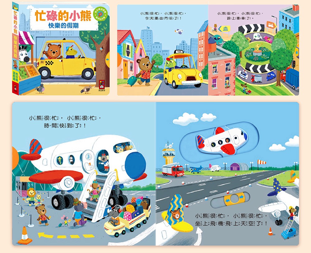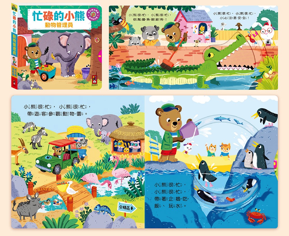 繪本鮮豔精緻的插圖吸引孩子目光,刺激孩子閱讀慾望,一起和忙碌的小熊探索生活不同風景,從閱讀跟遊戲中探索世界。