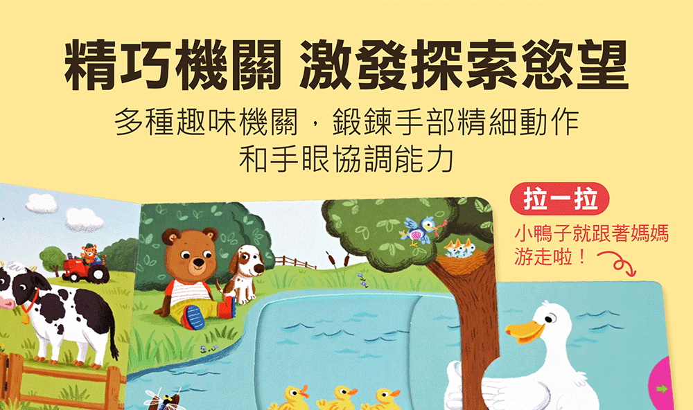 不同推推、拉拉、轉轉、滑滑的互動機關,讓孩子能促進手眼協調,強化視覺發展,也幫助大腦開發。
