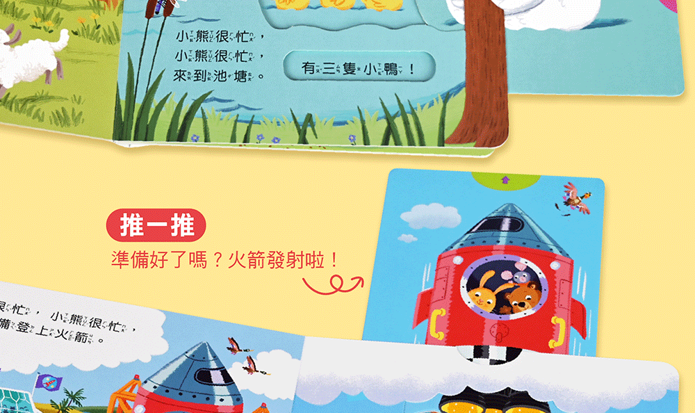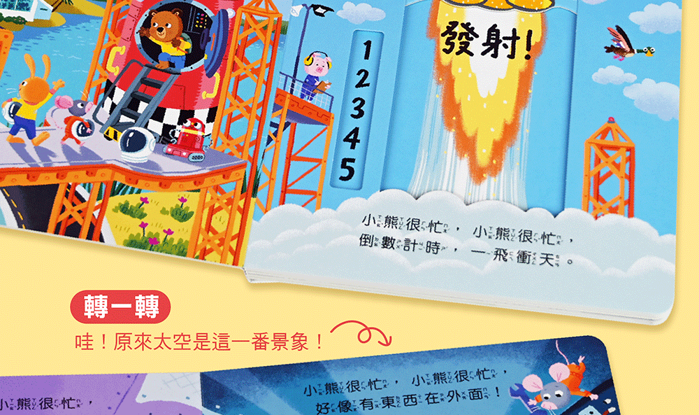 推推、拉拉,轉轉,閱讀好好玩!忙碌小熊化身太空人,一起探索神秘的宇宙吧!