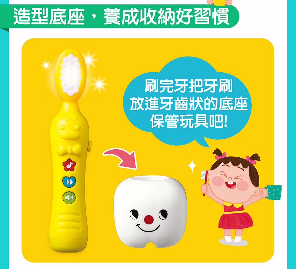 內附有聲牙刷,輕壓刷頭會發出刷牙音效 聲,搖晃牙刷也能發出漱口聲音,並且有三首中英刷牙歌,再加上三種燈光效果,吸引孩子目光,讓孩子愛不釋手!同時也有牙齒底座可供收納,輕鬆學習刷牙好習慣!