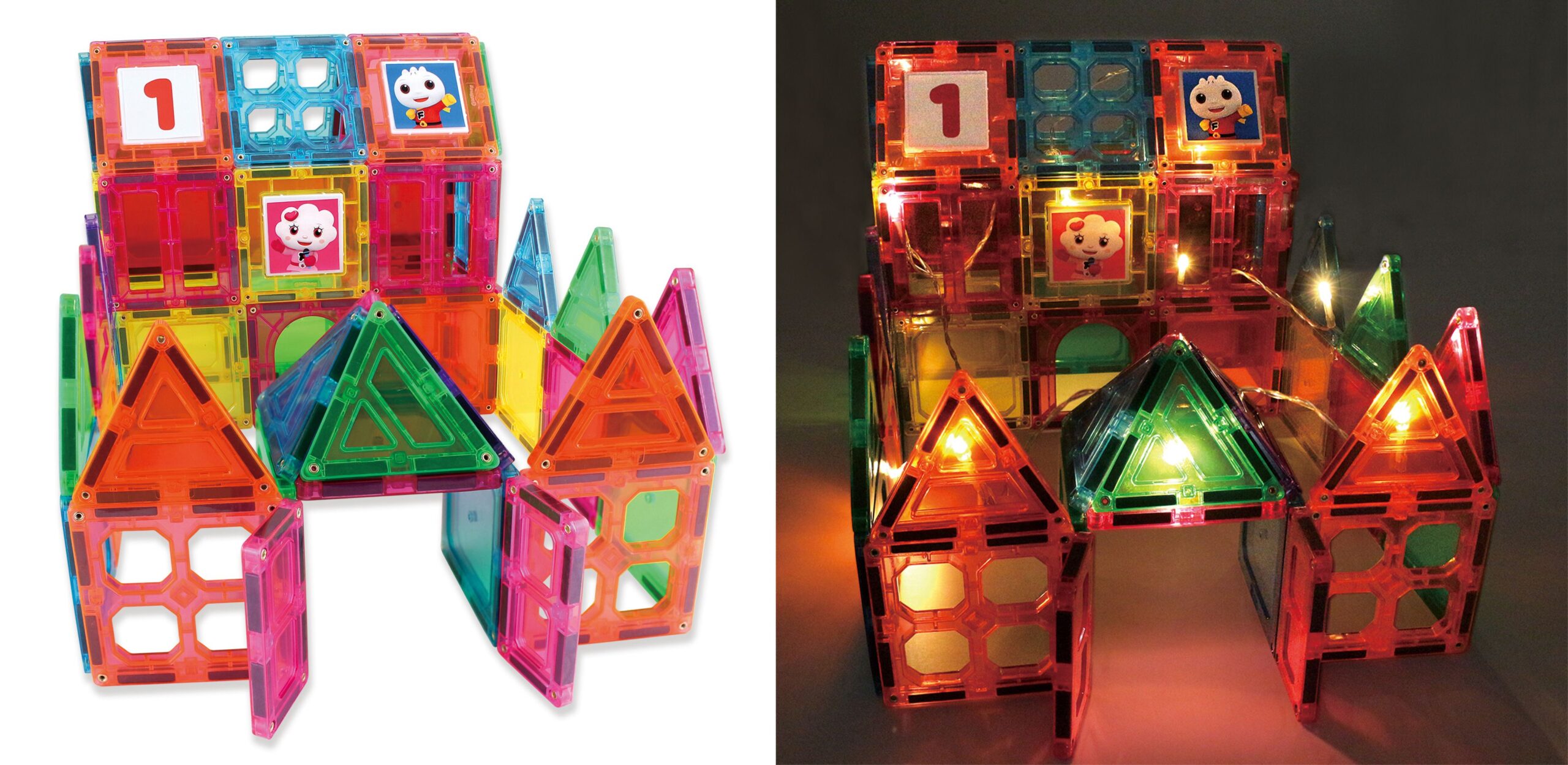內容物:90片磁力片+1個亮閃燈炮組+1張造型貼紙+1本手冊